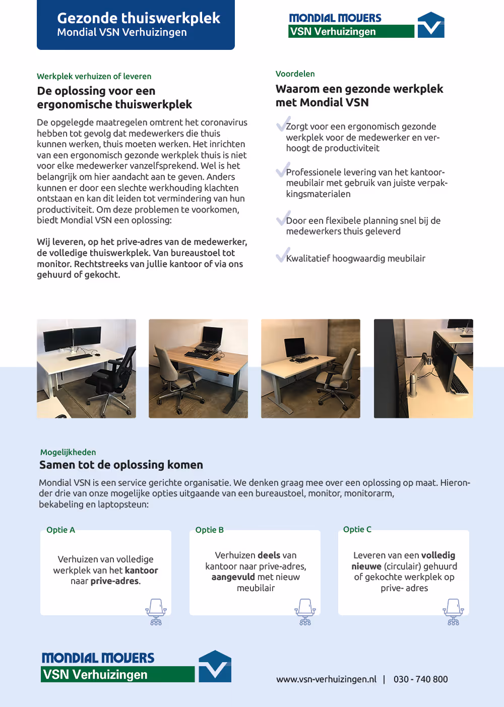 Mondial VSN is een service gerichte organisatie en denkt graag met uw bedrijf en uw medewerkers mee over een oplossing op maat. Wij bieden de volgende drie opties aan (uitgaande van een bureaustoel, monitor, monitorarm, bekabeling en laptopsteun): Verhuizen van volledige werkplek van het kantoor naar privé-adresVerhuizing deels van kantoor naar privé-adres, aangevuld met nieuw meubilairLeveren van een volledig nieuwe (circulair) gehuurde of gekochte werkplek op privé-adres